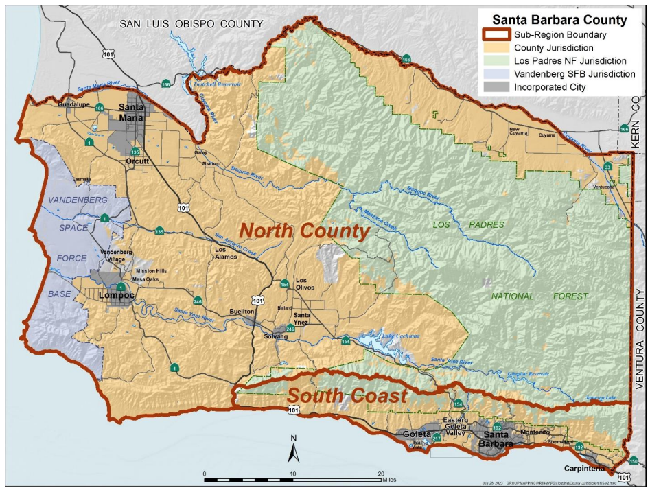 Regional Housing Needs Allocation (RHNA) Sub-Regions, South Coast and North County. Credit: SBC Housing Element Update, 2023
